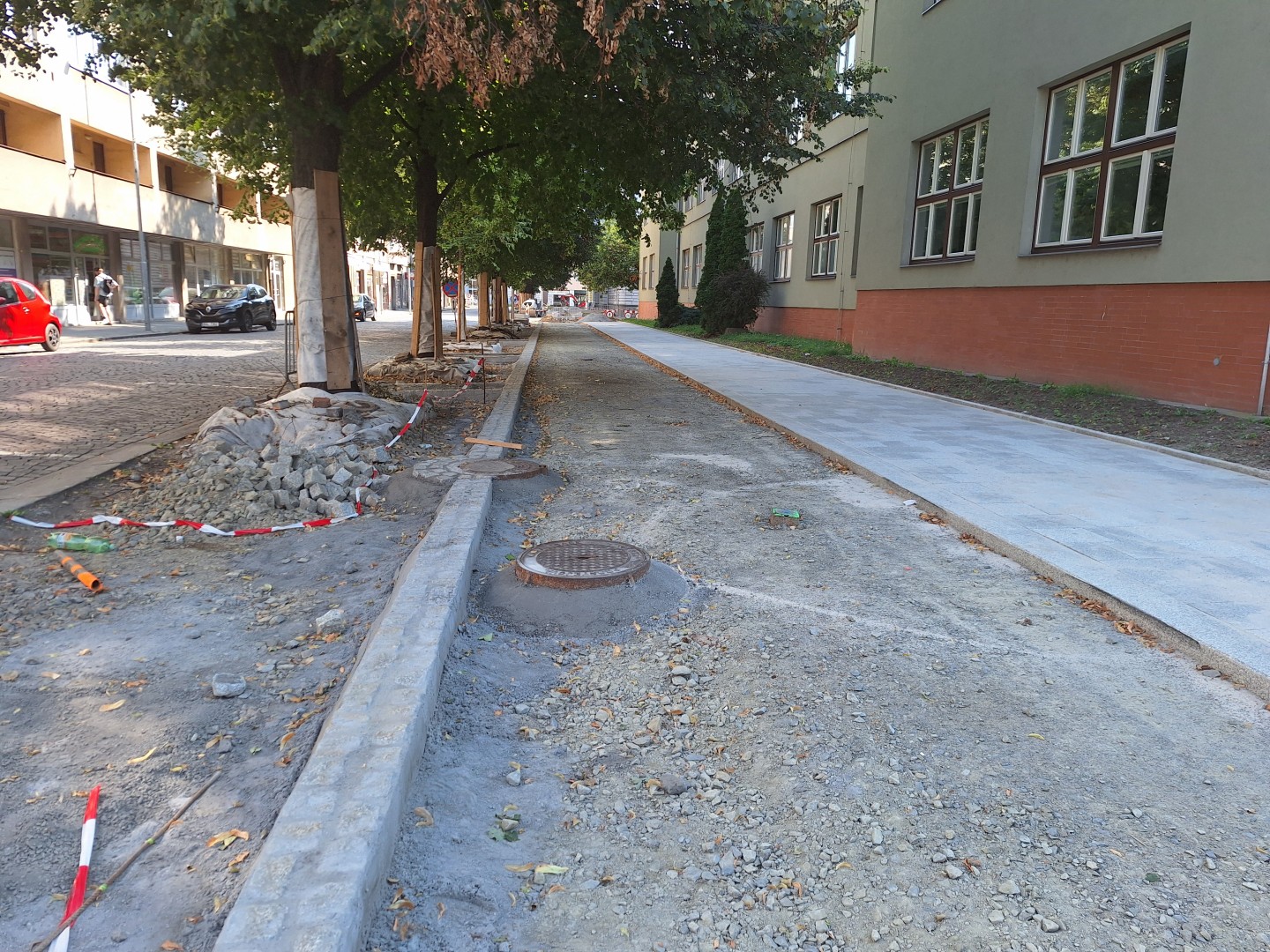 V této ulici jsou stávající chodníky řešeny ve 2 výškových úrovních s použitím dlažby 30 x 30 cm, jsou v nevyhovujícím stavu zvláště na západní straně. Podél chodníků vede stávající cyklostezka s asfaltovým povrchem. V uličním profilu jsou podél chodníku stávající vzrostlé stromy.