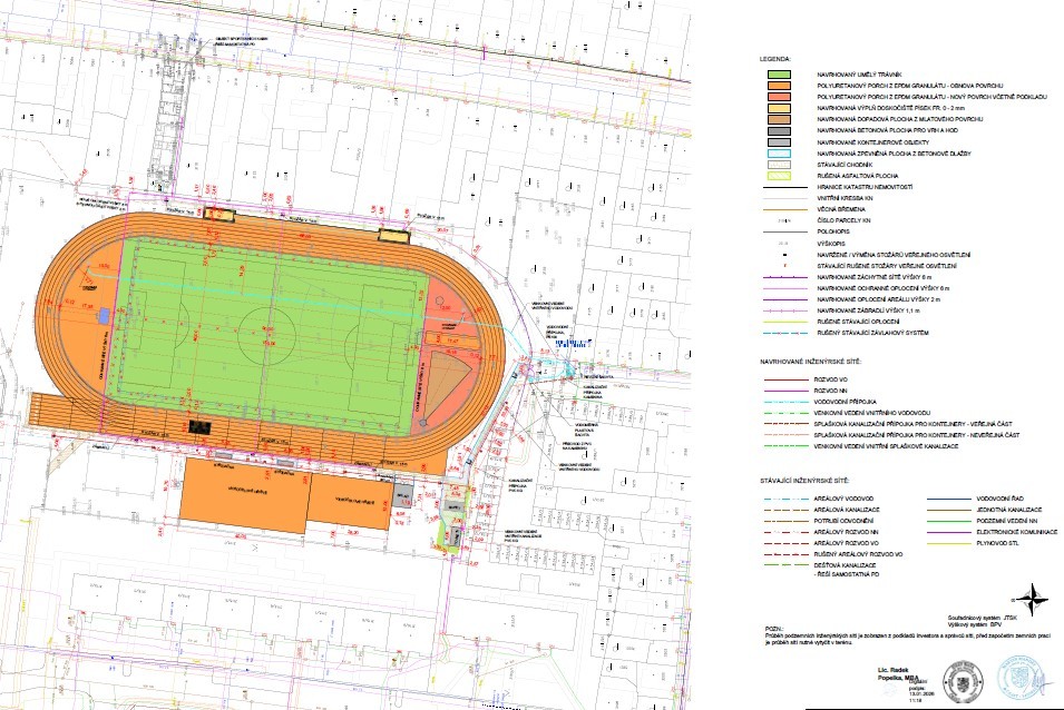 SO 02 – Běžecký ovál a atletické sektory: Zachování rozměrů oválu, výměna povrchu za polyuretan. Budou zrealizovány nové odvodňovací žlaby s pozinkovaným roštem. V jižní úseči bude umístěn sektor pro vrh koulí s betonovou odhazovou plochou a dopadištěm s mlatovým povrchem. Rozběh pro hod míčkem bude délky 17,50 m a šířky 4,00 m. Sektor pro skok daleký bude nově umístěn podél východního okraje atletického oválu a bude se skládat ze dvou doskočišť o rozměrech 10,00 m x 2,80 m, rozběh 47 m, nově doskočiště s drenážním odvodněním DN 80.