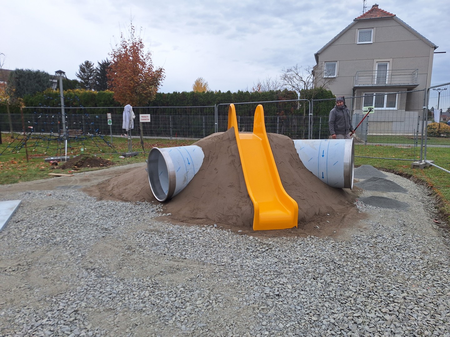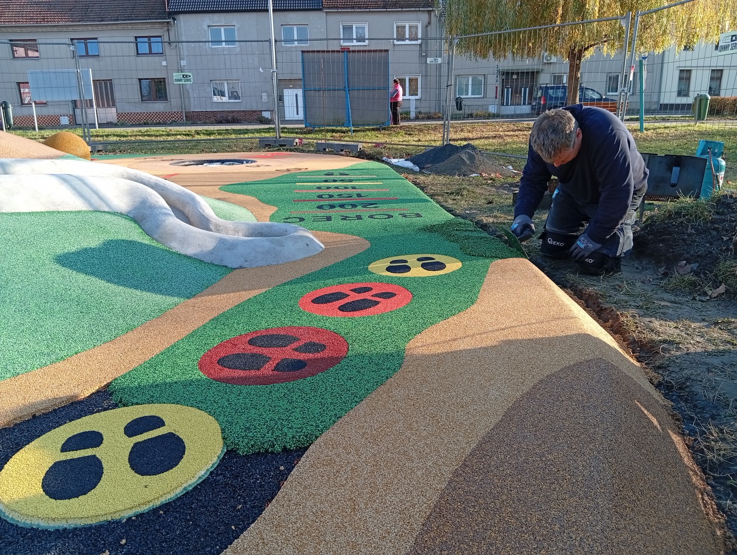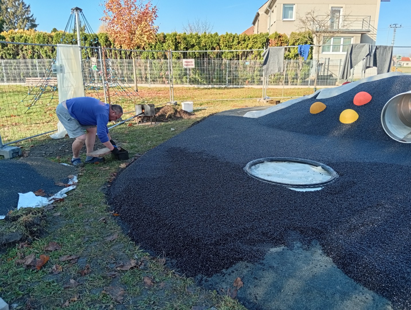 Od 30.10. byla zahájena realizace spodní stavby, od 4.11. se prováděla pokládka a tvarování pryžové vrstvy a umístění jednotlivých plošných prvků. Ještě chybí terénní práce a dokončení hřiště. Předpoklad ukončení prací je 20. listopadu.