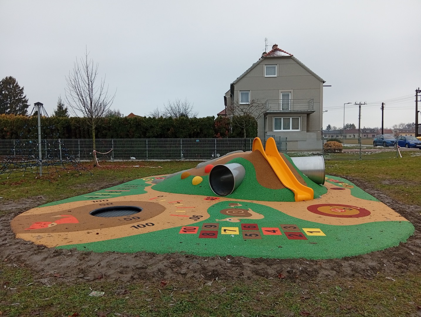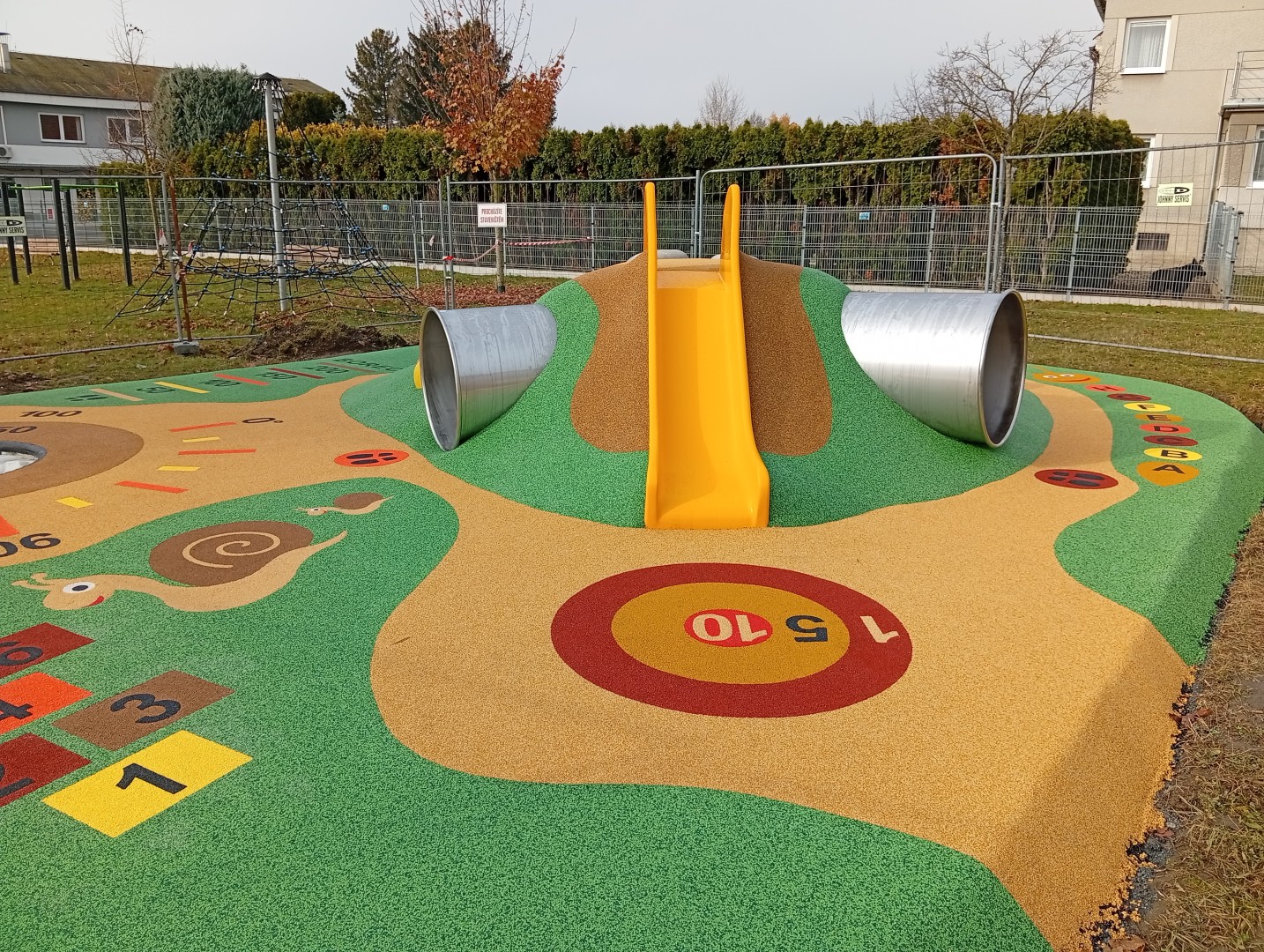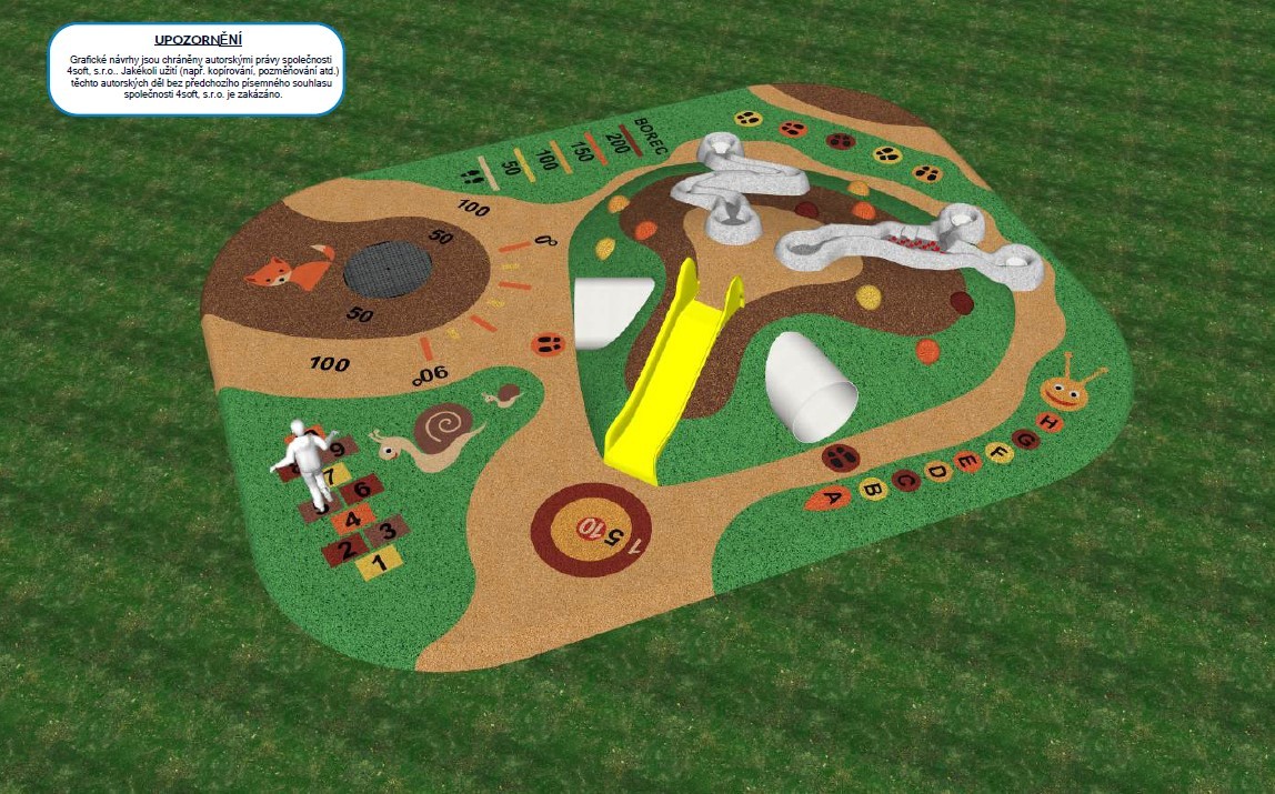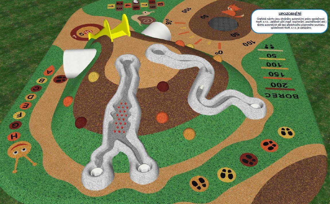 Umělý kopeček s plastovou skluzavkou, nerezovým zahnutým tunelem a 2 kuličkovými drahami o celkové délce cca 9 m (jedna s překážkovým prvkem), na něm rozmístěné polokoule (max. 10 ks), trampolína (např. kruhová se skákací plochou o průměru 107 cm) s bodovým měřením doskoku (stačí 2 hodnoty, např. 50 a 100), 2D prvky typu skok do dálky, stopy, skákací panák s čísly, terč, housenka s písmeny, obrázky 3 zvířat (šnek a baby šnek, liška).