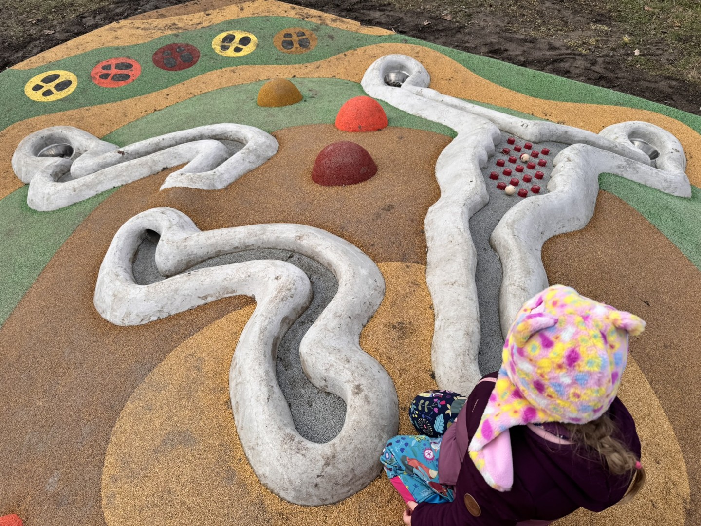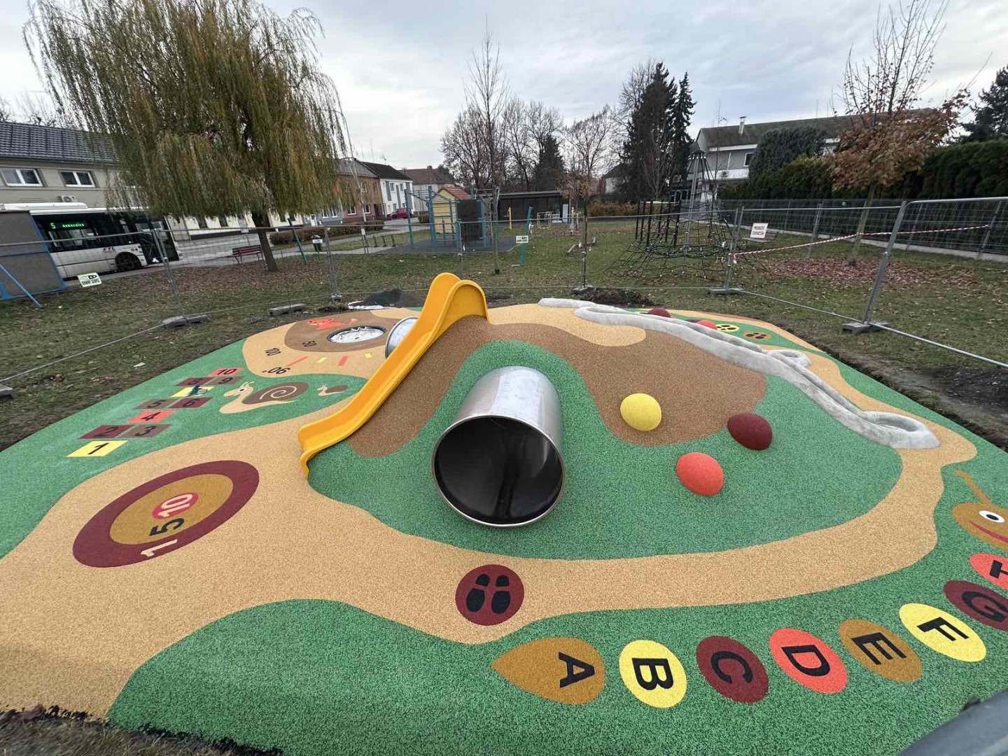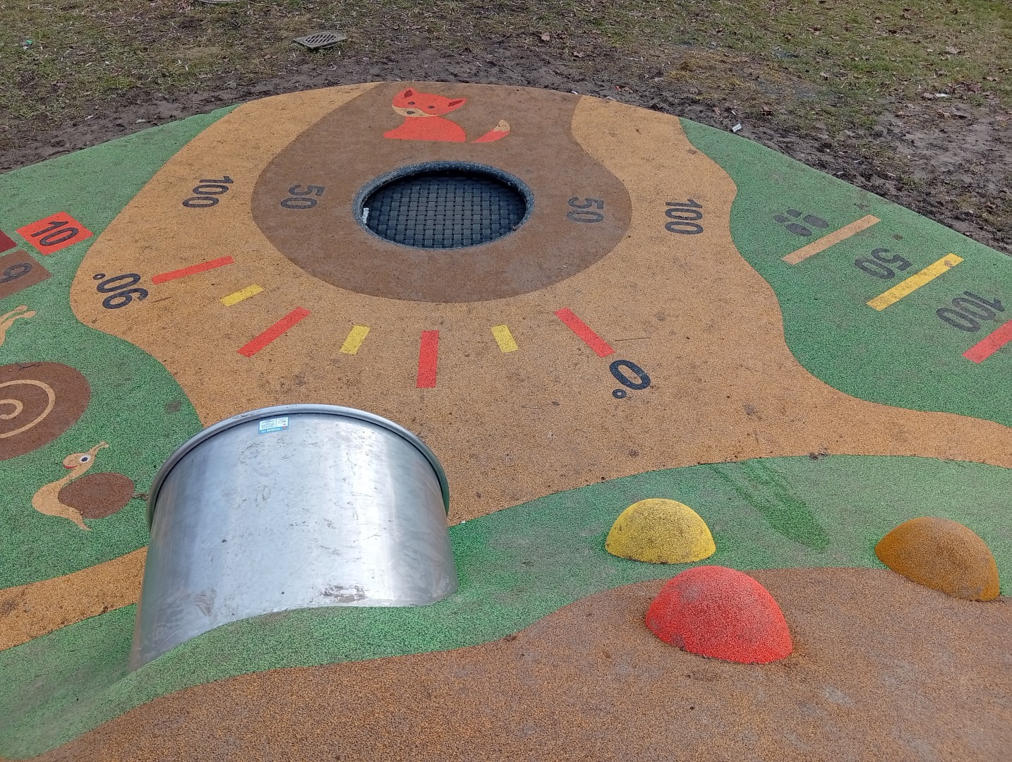 Umělý kopeček s plastovou skluzavkou, nerezovým zahnutým tunelem a 2 kuličkovými drahami o celkové délce cca 9 m (jedna s překážkovým prvkem), na něm rozmístěné polokoule (max. 10 ks), trampolína (např. kruhová se skákací plochou o průměru 107 cm) s bodovým měřením doskoku (stačí 2 hodnoty, např. 50 a 100), 2D prvky typu skok do dálky, stopy, skákací panák s čísly, terč, housenka s písmeny, obrázky 3 zvířat (šnek a baby šnek, liška).