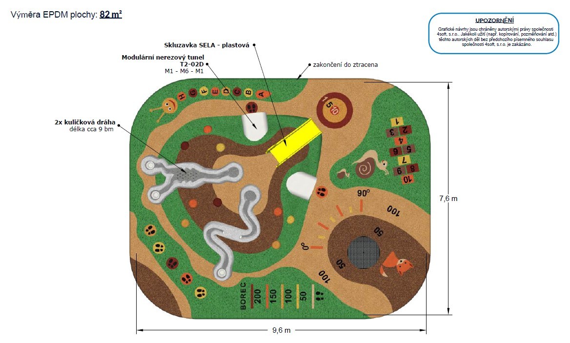 V červenci a srpnu 2025 byl proveden průzkum trhu a nejlepší nabídku předložila společnost 4 soft s.r.o. s návrhem hřiště o velikosti 7,6 m x 9,6 m, který obsahuje: